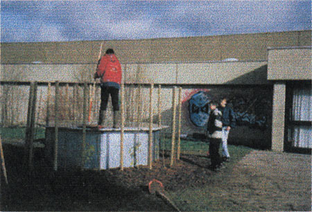 Special trees are planted around an object at a school. They will grow and be cut and trained into a circular shape, creating, a growing living, room. The children watching, moving, interacting and playing within this environment are encouraged to be more aware through everyday interaction about this living species.